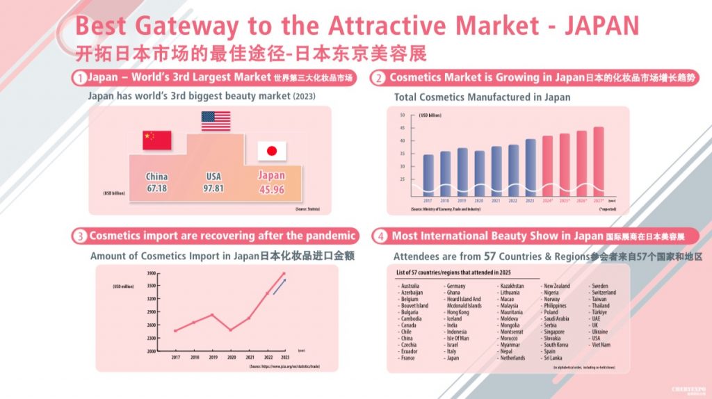 上一届展会数据:2025年1月日本国际美妆周东京站共有参展商800余家,参展观众超50000人,参与者来自全球57个国家和地区。其中,超80家中国企业参展,涵盖原料、代工、工具等领域,占国际展商总数15%。